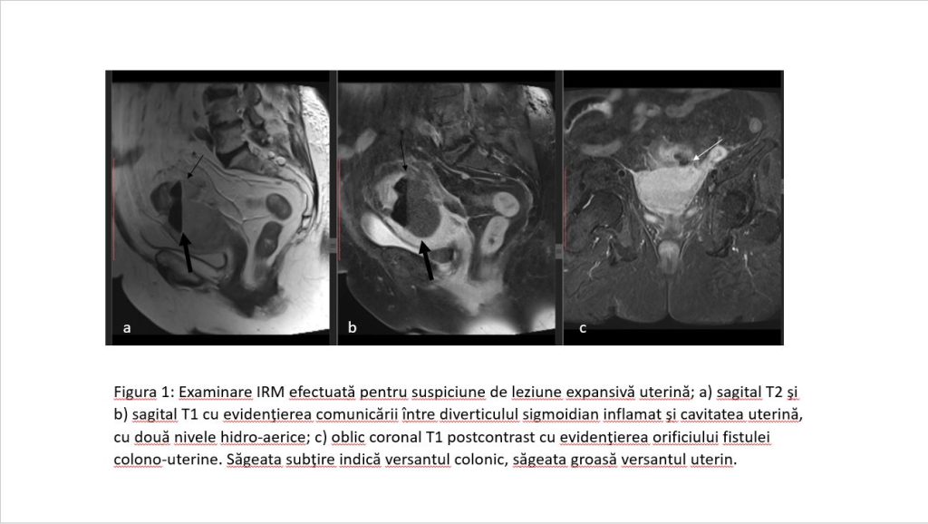 Figura 1: Examinare IRM efectuată pentru suspiciune de leziune expansivă uterină; a) sagital T2 şi b) sagital T1 cu evidenţierea comunicării între diverticulul sigmoidian inflamat şi cavitatea uterină, cu două nivele hidro-aerice; c) oblic coronal T1 postcontrast cu evidenţierea orificiului fistulei colono-uterine. Săgeata subţire indică versantul colonic, săgeata groasă versantul uterin.