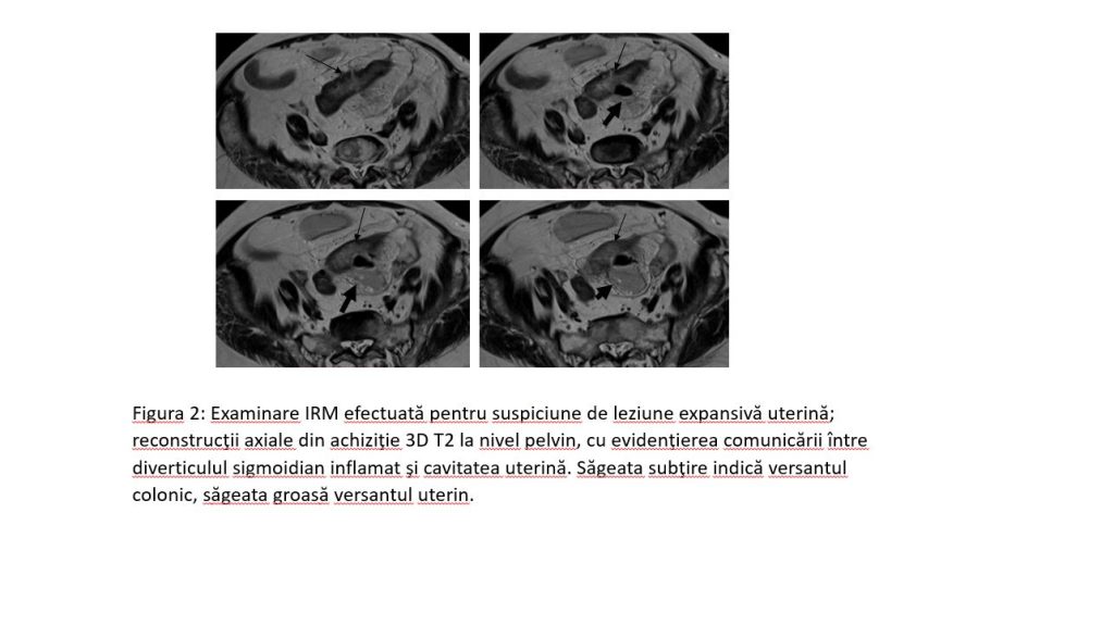 Figura 2: Examinare IRM efectuată pentru suspiciune de leziune expansivă uterină; reconstrucţii axiale din achiziţie 3D T2 la nivel pelvin, cu evidenţierea comunicării între diverticulul sigmoidian inflamat şi cavitatea uterină. Săgeata subţire indică versantul colonic, săgeata groasă versantul uterin.