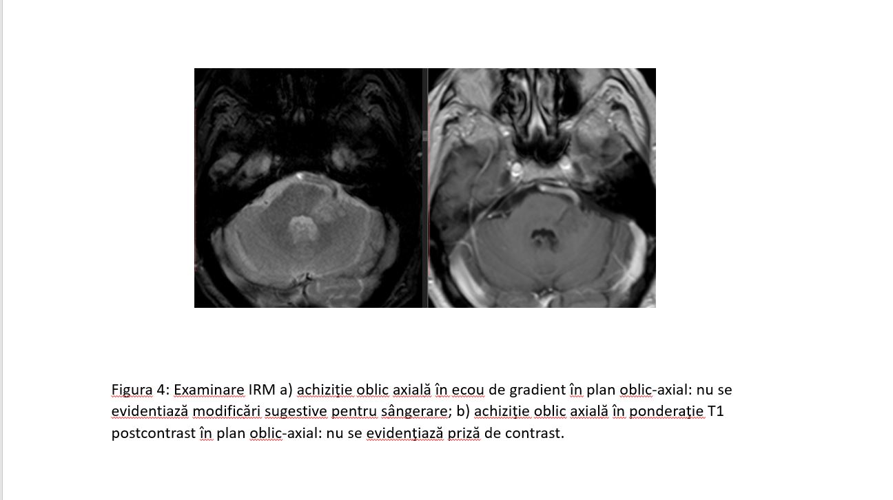 Acești pacienți ajung de obicei la examinare CT, în cazul nostru am efectuat examinare IRM deoarece pacienta s-a prezentat la consult ginecologic pentru dureri pelvine şi secreții în cantitate mare şi la ecografie s-a ridicat suspiciunea de formațiune tumorală uterină.