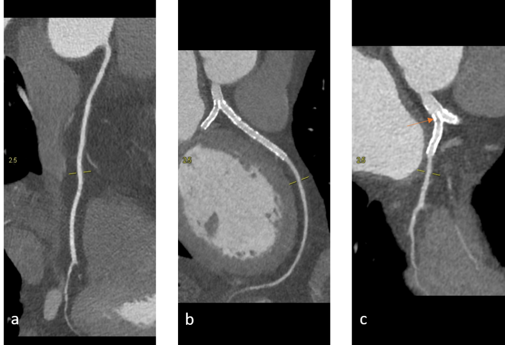Examinarea CT nu se face de rutină pentru control după montarea stentului, ci dacă există suspiciunea de boală coronariană nou apărută. La pacienții cu suspiciunea de boală coronariană semnificativă nou apărută, examinarea de elecţie este coronarografia invazivă deoarece este gold standard şi poate face în aceeaşi sedinţă diagnostic şi tratament.