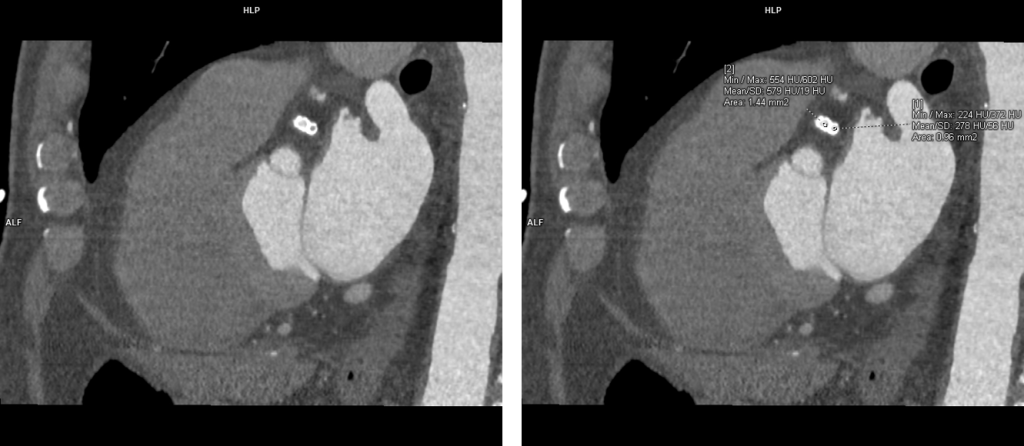 Stenturile coronariene proximale sunt în general corect evaluate prin examinare angioCT cardiacă cu sincronizare ECG pe aparate cu cel putin 64 de detectori. Prin examinare CT nu se poate vizualiza sensul de curgere a sângelui.