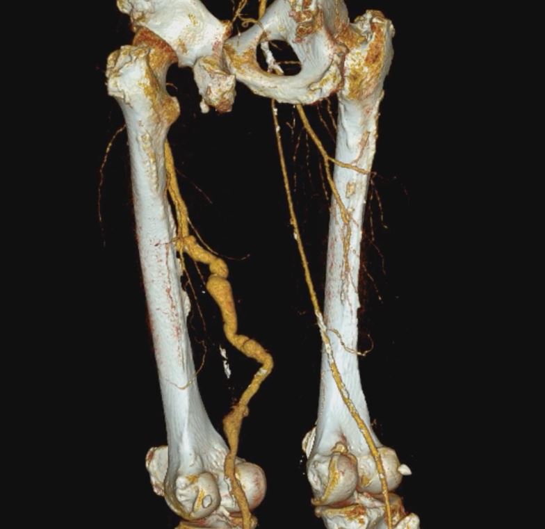 Angiografia de membre inferioare efectuată prin computer tomografie (CT) are sensibilitate şi specificitate bune în detecția leziunilor vasculare de tip arterial de la nivelul membrelor inferioare. Examinarea CT evidențiază calciul de la nivelul plăcilor aterotrombotice, dar şi componenta necalcificată şi poate cuantifica gradul de stenoză precum şi prezenta de colaterale.