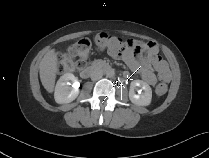 DE LUAT ACASĂ!!! Examinarea CT cu achiziție tardivă de tip uroCT este indicată la pacienții cu sindrom obstructiv pentru aprecierea cauzelor obstrucției. Chiar și la pacienții cunoscuți cu litiaza reno-urinară examinarea trebuie efectuată cu substanța de contrast pentru evidențierea și caracterizarea obstacolului precum și pentru aprecierea efectului asupra căilor urinare: rinichi fără excreție, obstacol parțial obstructiv, ruptură de căi urinare etc. Una dintre anomaliile de formare a venei cave inferioare este și ureterul retrocav, variantă anomaliei prezentate aici.