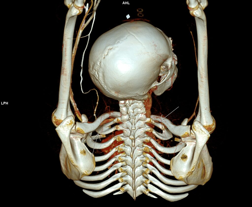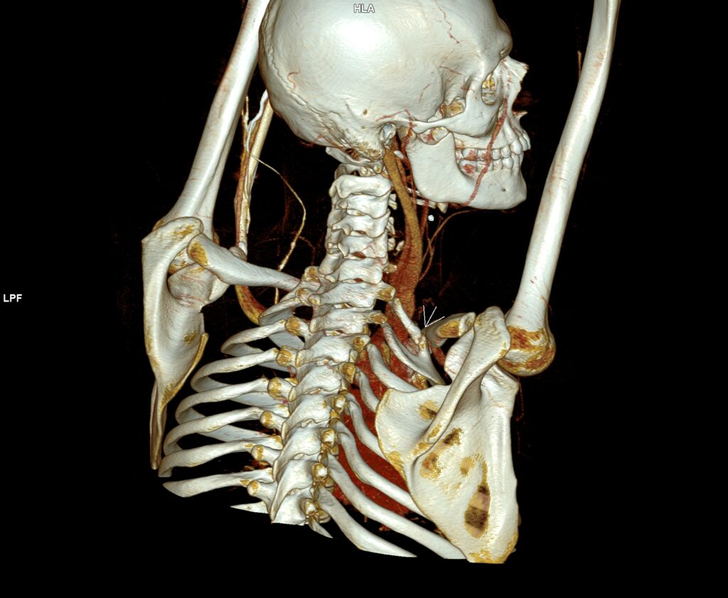 - Farzam F, Barakzai Y, Foladi N. Arterial thoracic outlet syndrome by a commonly overlooked anomaly, the cervical rib: A case report. Radiol Case Rep. 2023 Jul 18;18(9):3351-3356. doi: 10.1016/j.radcr.2023.06.068. PMID: 37502135; PMCID: PMC10371763.