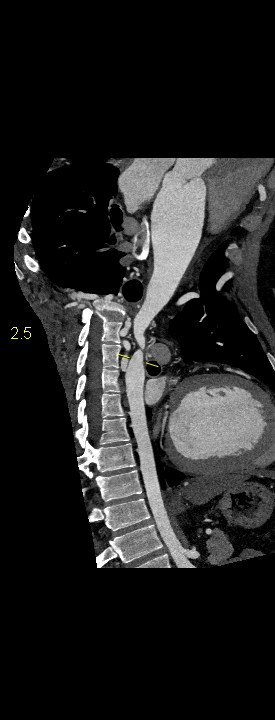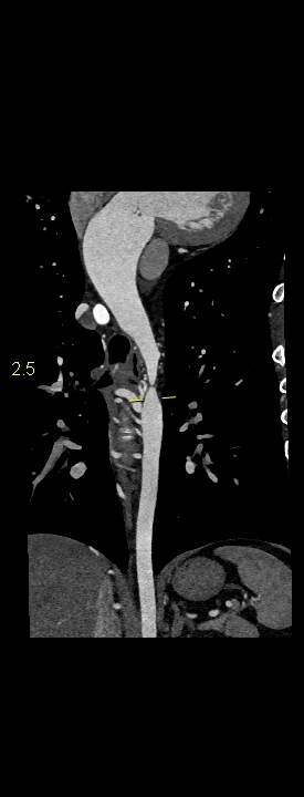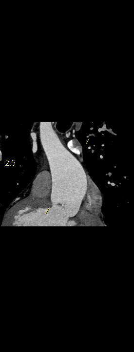 Discuţie caz nr 109: Pacient cu suspiciune de coarctaţie de aortă – are indicație de angioCT aortă toracică; medicul radiolog la acești pacienți este indicat să efectueze investigația cu sincronizare ECG deoarece coarctaţia de aortă poate fi asociată și cu bicuspidie de valvă aortică, mai ales că la acest pacient ecografia cardiacă descria creștere de calibru a aortei ascendențe. Pe reconstrucția cine în planul valvei aortice din achiziția cardioCT cu sincronizare ECG se remarcă o valvă aortică morfologic tricuspidă, funcțional bicuspidă ce asociază ectazie de aortă ascendentă și coarctaţie de aortă descendentă cvasicompletă cu dezvoltare de circulație colaterală intercostală și mamară internă.