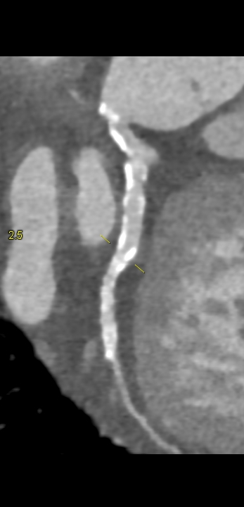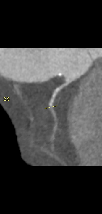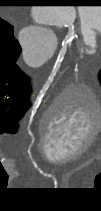 Figura 2: reconstrucție “în lungul vasului” artera descendentă anterioară din achiziția angiocoroCT