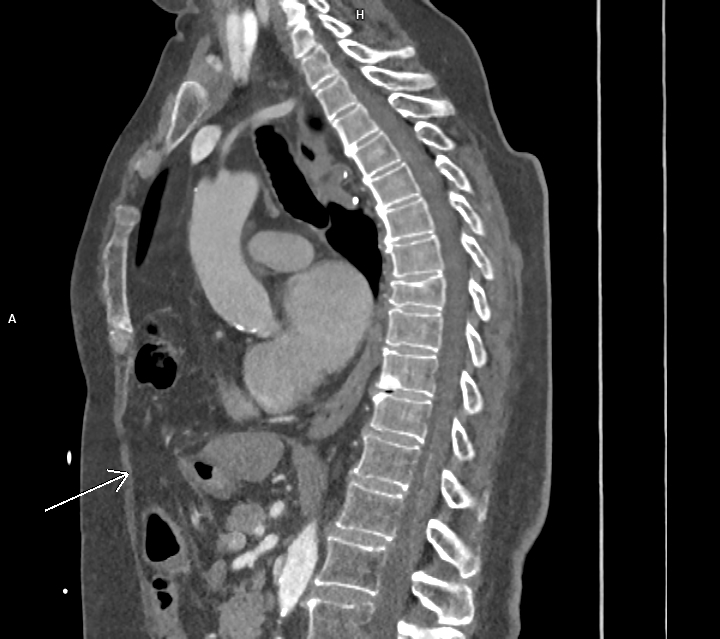 Discuţie caz nr 127: se evidențiază hernierea intratoracică a jumătății distale a colonului ascendent, unghiului hepatic al colonului și a unei părți din colonul transvers printr-un orificiu herniar situat anterior de partea dreapta împreună cu o parte din mezocolon.
