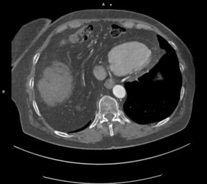 Figurile 3 şi 4: axial CT în timp venos torace şi abdomen superior