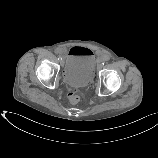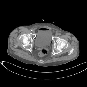 Discuţie caz nr 131: pacient de 85 de ani cunoscut diabetic este adus la camera de gardă pentru dureri abdominale difuze, efectueaza CT fără substanță de contrast deoarece eGFR este 21 mL/min/1.73 m². Se evidențiază pericardita în cantitate medie, mai multe chiste renale – unul spontan hiperdens, multiple plăci aterotrombotice calcificate la nivelul aortei și ramurilor precum și multiple bule aerice în peretele vezicii urinare și conținut hidro-aeric al vezicii urinare. Ultimele două elemente sugerează diagnosticul de cistita emfizematoasă.