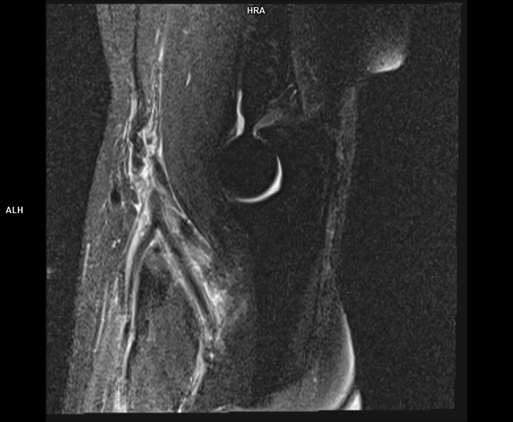 Figura 2: achiziție sagital T2 cu saturația grăsimii la nivelul cotului cu evidențierea tendonului de inserție inferioară a mușchiului biceps brahial ce este retractat superior
