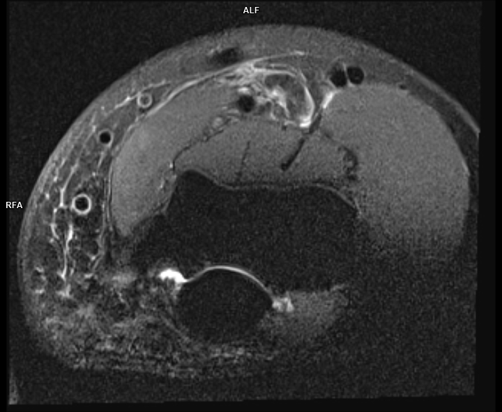 Figura 3: achiziție axial PD cu saturația grăsimii la nivelul cotului cu evidențierea tendonului de inserție inferioară a mușchiului biceps brachial ce este situat superior și are traiect serpiginos