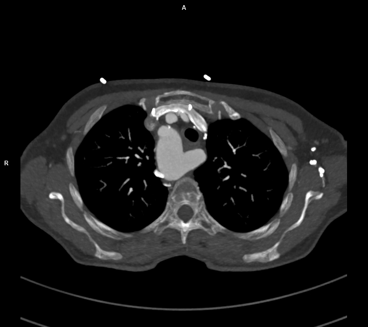 Figura 1: reconstrucție axială din achiziție angioCT toracică; se evidențiază arc aortic poziționat la dreapta cu originea arterei subclavii stângi dintr-o leziune cu aspect diverticular ce se dezvoltă posterior de trahee și esofag și anterior de coloana vertebrală tpracala – structura denumită diverticul Kommerell