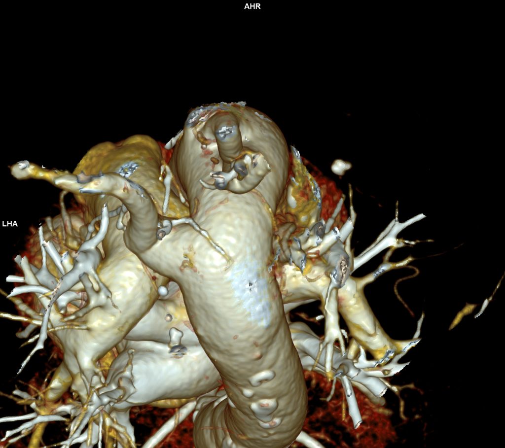 Discuţie caz nr 57:  pacient asimptomatic care a efectuat angioCT de aorta toracică pentru evaluarea unei creșteri de calibru a aortei la examinarea ecocardiografica. Este o anomalie de dezvoltare a arcului aortic, ce este situat la dreapta, cu originea arterei subclavii stângi dintr-o structura diverticulară.