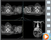 Video 1: examinare CT în 3 faze cu localizator coronal; se evidențiază o leziune expansivă densă, iodofilă dezvoltată în țesutul gras subcutanat al umărului stâng în contact cu tegumentul;