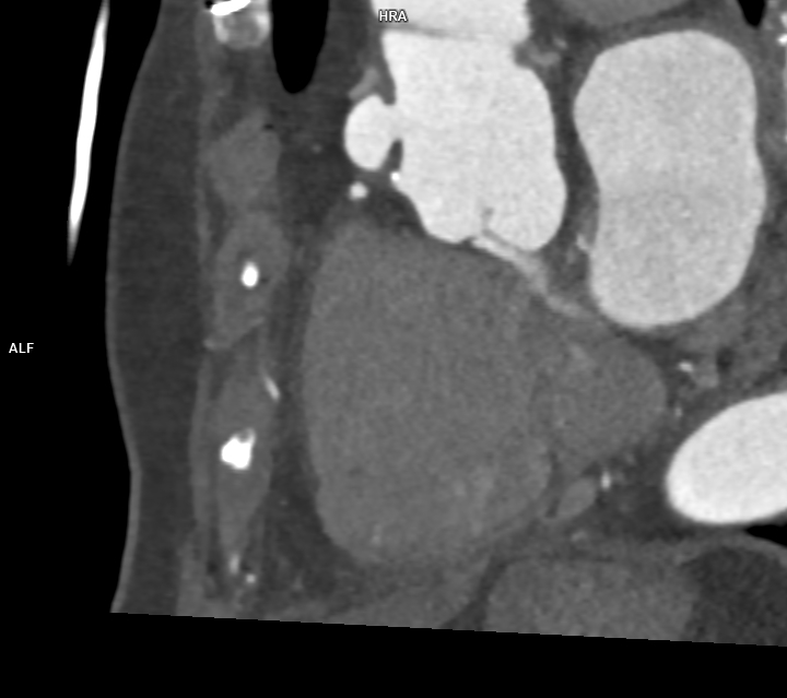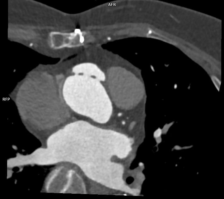 Figura 1: Reconstrucţie în planul aortei ascendente cu evidenţierea anevrismului format la inserţia inferioară a protezei de aortă ascendentă