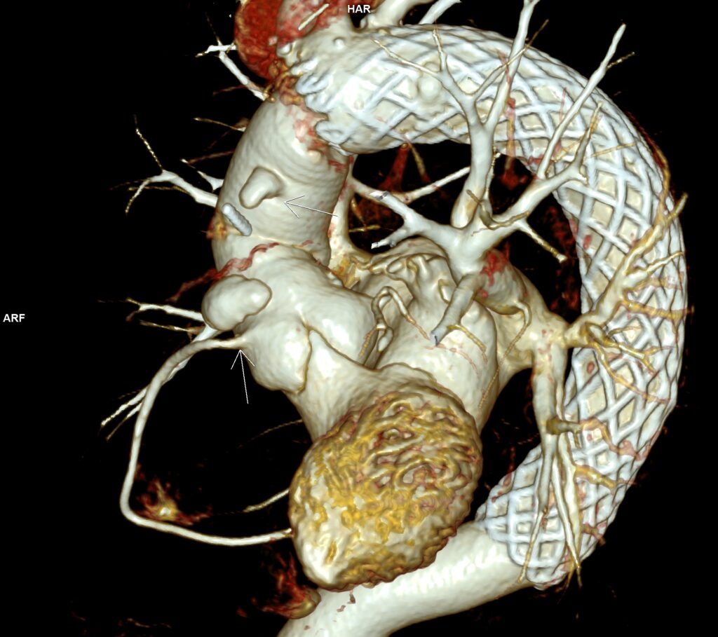 Pacient cunoscut cu proteză de aorta ascendentă și proteză endoaortică pentru dilatație anevrismală a aortei ascendente și descendente toracice, efectuează examinare angioCT pentru control postoperator. Se evidențiază câte o dezvoltare anevrismală la inserțiile inferioară și superioară ale protezei de aortă ascendentă și proteză metalică endoaortică de aorta descendentă în poziție normală. Incidental se evidențiază un fald de disecție în segmentul proximal al arterei carotide comune stâng cu ambele lumene circulante.