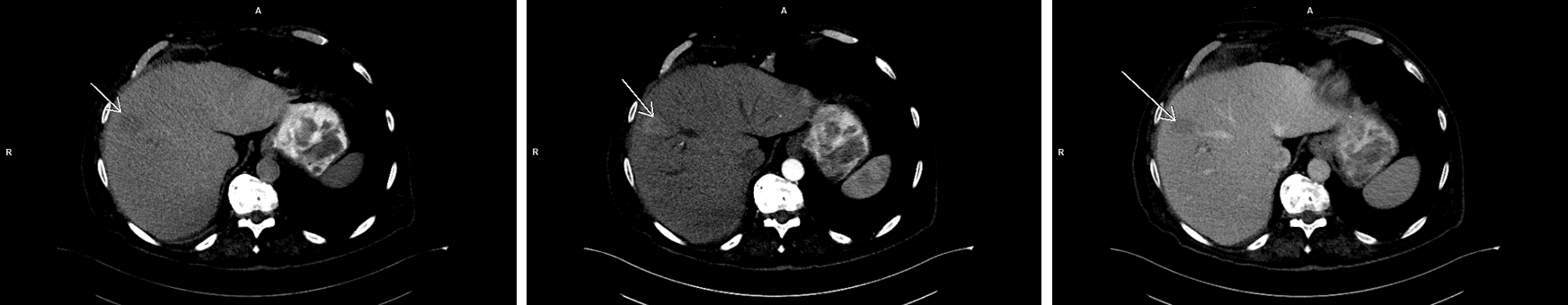 Figura 1: axial CT nativ, timp arterial și timp venos