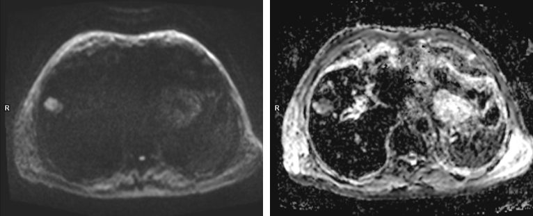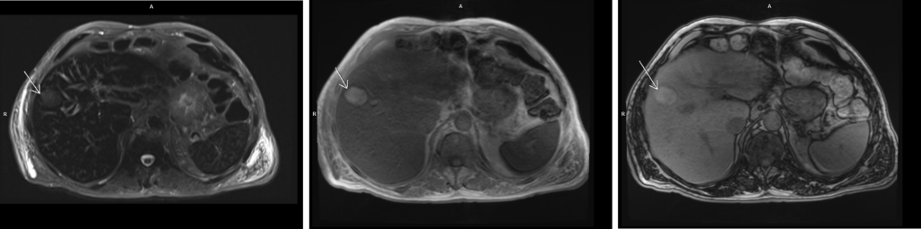 Pacientul era cunoscut cu polipoza adenomatoasă și i s-a descoperit întâmplător la ecografie o leziune expansivă hepatică. Pe examinarea CT nu a putut fi caracterizat convenabil iar la examinarea IRM s-a decelat o leziune spontan în hipersemnal T1 cu priză de contrast în timp precoce și fenomen de spălare rapidă a contrastului în timp venos / tardiv.