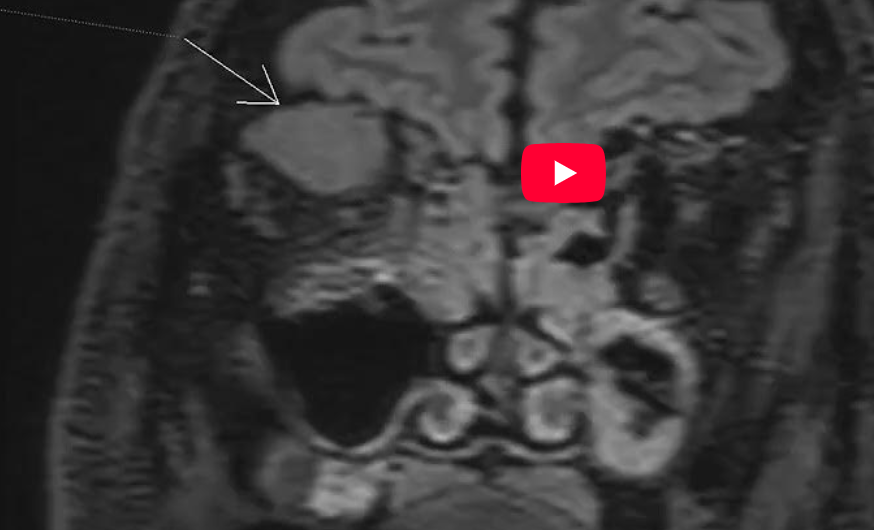DE LUAT ACASĂ!!! Pentru examinarea IRM a orbitelor se folosește un protocol special dedicat cu achiziția T1 pre și postcontrast cu saturația grăsimii; în acest caz se poate observă Video 5 efectuat postcontrast fără saturația grăsimii pentru parenchimul cerebral în comparație cu imaginile coronale T1 cu saturația grăsimii Video 7.