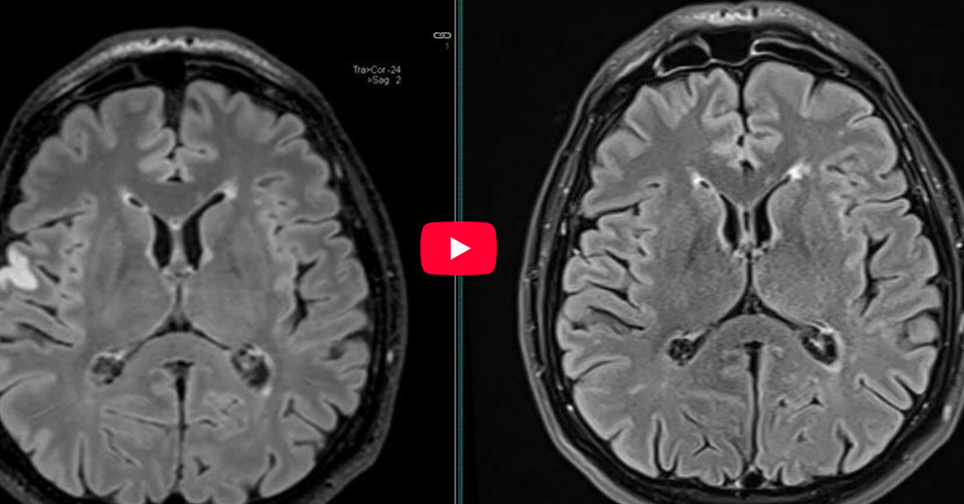 Video 3: axial FLAIR comparativ supraacut în dreapta și trei zile mai tarziu în stânga