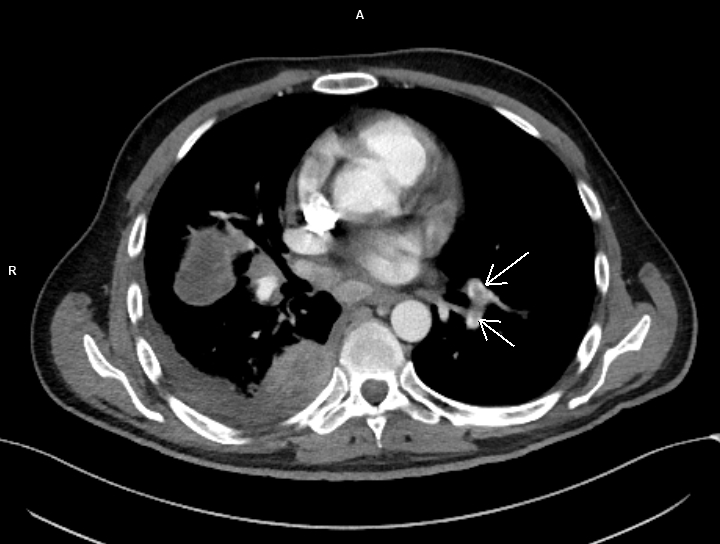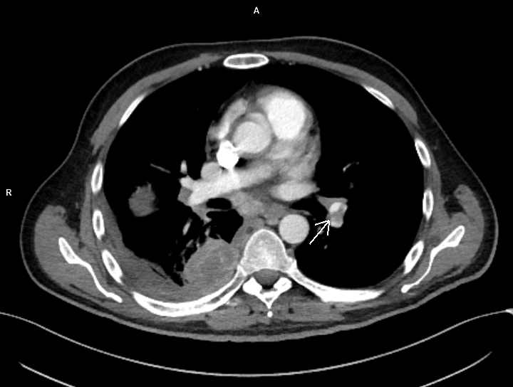 Discuţie caz nr 99: pacientul s-a prezentat în urgență și a fost trimis la examinarea CT cu suspiciune de trombembolism pulmonar. Examinarea CT efectuată toracic care a surprins și o parte din abdomenul superior evidențiază trombembolism pulmonar acut stâng la nivelul arterei intermediare cu evoluție și la nivelul arterelor segmentare și subsegmentare precum și tumoră renală stânga de pol inferior cu aspect de carcinom cu celule clare (Grawitz) și determinări secundare pleurale drepte.